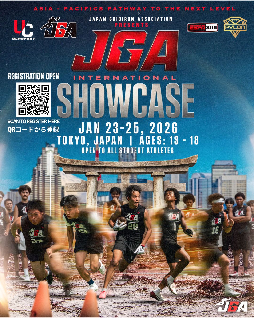 Japan Gridiron Association is proud to welcome you to a historic event—the first of its kind in Japan and the Asia-Pacific Region. In collaboration with The UCReport, Pylon 7on7 Football, and ESPN 300 Recruiting, this two-day showcase is designed to elevate the standard of American football development and exposure across the region. Athletes will experience verified combine testing, elite position-specific training, and globally recognized recruiting exposure from industry-leading partners. The event will conclude with a full-day 7on7 football tournament, hosted and sanctioned by Pylon, bringing top-tier competition to the international stage. This showcase marks a major milestone in expanding opportunity, visibility, and growth for athletes throughout Japan and beyond. Welcome to the future of American football in the Asia-Pacific.